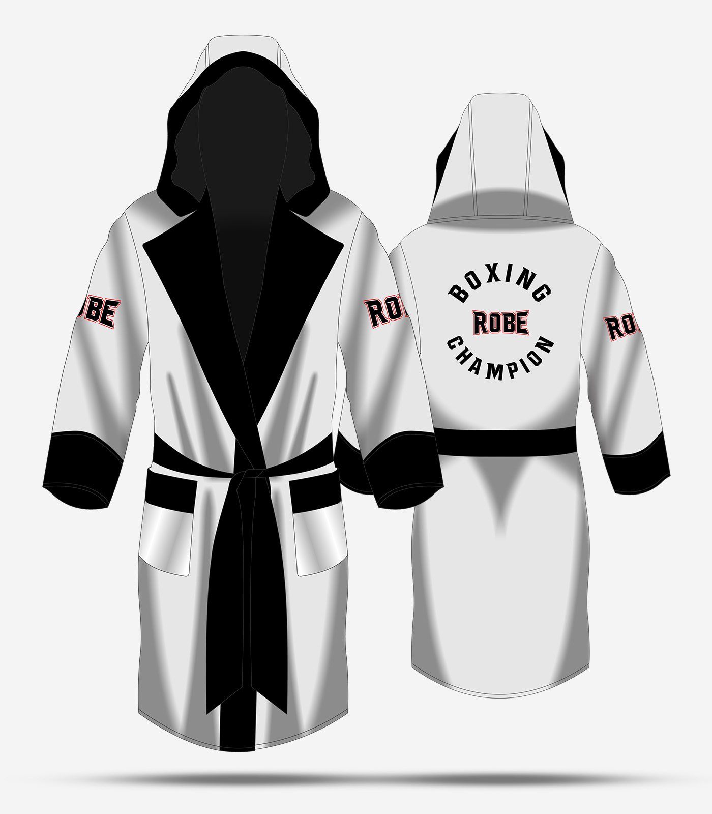 Affordable Easy style custom boxing robe. Amazing customisable, top quality boxing robe in Classic style. Our robes have a luxury feel and are made from the best quality fabrics. You can order our customisable boxing robes in a large range of colours and although we normally recommend satin as the main material, highlight colours look great in other fabrics such as high shine (wet look) or sequins. We now also offer some unique luxury satin prints. If you are looking for a full set of gear, you may want to team your boxing robe with a pair of matching boxing shorts and even full leather gloves. Customised robes are also really popular with corporate customers who use for promotions or as rewards for performance. Personalise easily by Message and get fast delivery anywhere in the world. We offer different postage and production options depending on how fast you need your item and what your budget is.